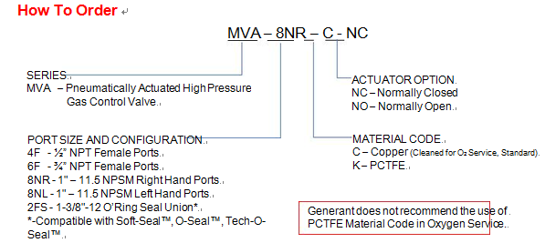 The Series MVA Pneumatically Actuated High Pressure Gas Control Valve is optimized for the demanding requirements of Automated Gas Cylinder Fill Plants, Manifold, and Piping System applications. The High Pressure Oxygen Service Valve Configuration (Seal Option C) was third  party tested per ISO 7291 (O2 Surge) and ASTM G175 (PromotedIgnition). The valve is also available with a PCTFE seal (Seal Option K) for positive sealing in non-oxygen applications. Series MVA valves can be specified Normally Open (-NO) or Normally Closed (-NC) and are available in a variety of porting configurations. Normally closed version seals bubble-tight up to an inlet pressure of 5500 PSI with only 85 PSI  required to open valve to full orifice.